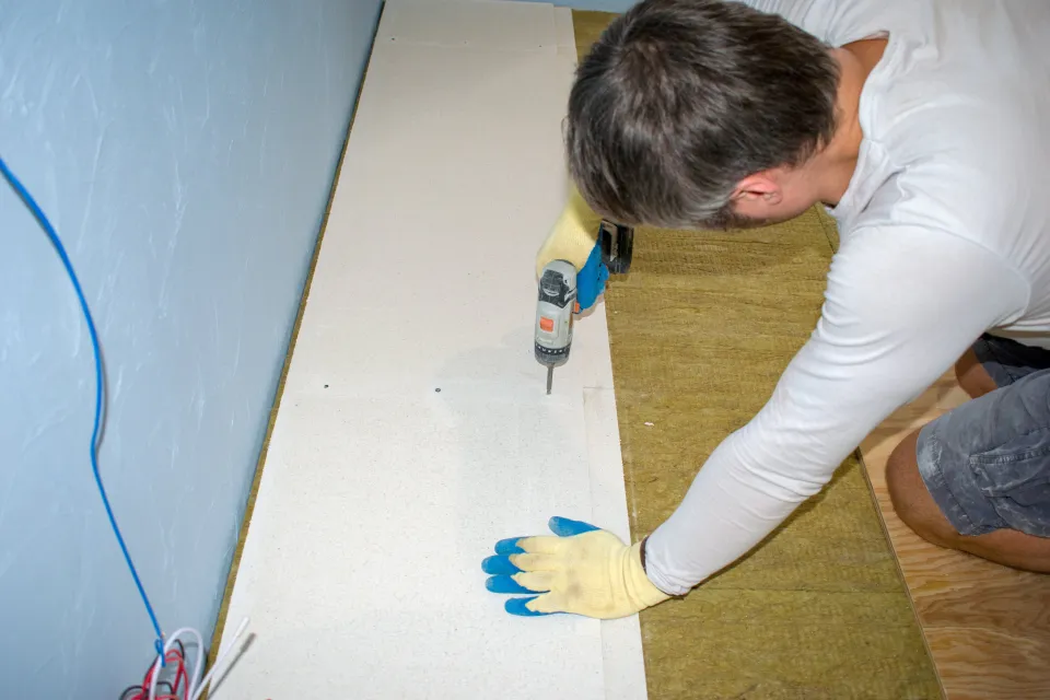 Application d' isolants directement sous votre plancher assurant une efficacité calorifique optimale sans compromettre votre hauteur habitable.